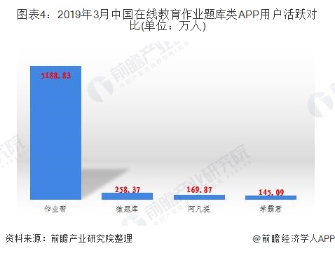 数据显示,在线教育题库类APP中,作业帮的活跃用户最多,接近5000万人,远超过其他同类在线教育题库的活跃用户。艾媒咨询分析师认为,作业帮将搜题工具、题库和在线辅导整合于一体,满足初高中学生全方位的学习需求,有着更强的用户粘性。
