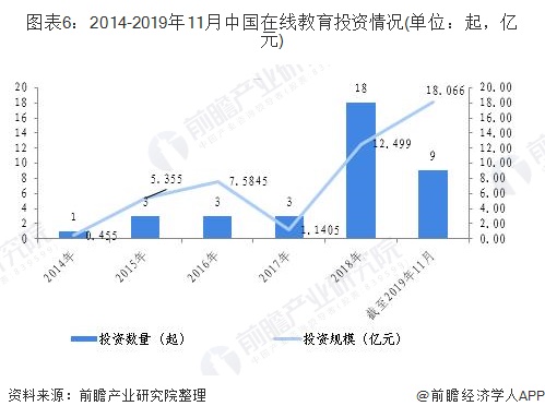 2014-2018年中国在线教育投融资规模快速增长,尤其是2018年投资数量达到18起,投资规模达12.50亿元,2019年我国在线教育投资数量明显下降,但投资规模却有所扩大,截至2019年11月,中国在线教育投资数量为9起,投资规模为18.07亿元。