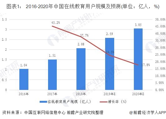 根据中国互联网络信息中心第44次《中国互联网络发展状况统计报告》数据显示,截至2019年6月,我国在线教育用户规模达2.32亿,较2018年底增长3122万,占网民整体的27.20%,全年在线教育用户规模预计将达2.59亿人。随着二胎政策全面开放,升学就业竞争压力不断增大,满足用户碎片化学习需求的在线教育用户规模将持续增长。预计2020中国在线教育用户规模将达3.05亿人。