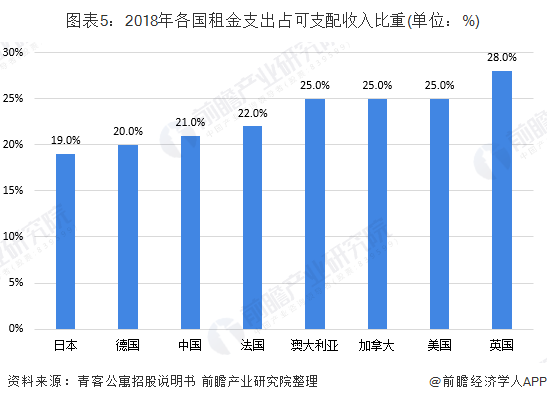 根据青客公寓招股说明书提供的数据,中国的租金水平仍然处于较低位置,未来仍有较大的提升空间。一方面,我国租金占可支配收入的比重较低,在2018年末为21.0%,相比英美发达国家的25.0%、28.0%仍然有一定的上升空间。