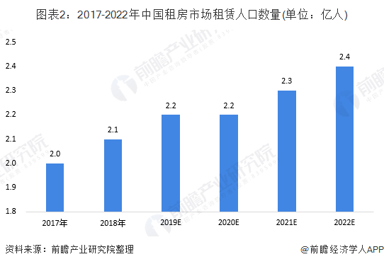 众多的流动人口数量必然带来大量的住房需求,在我国2018年的2.41亿流动人口中大约有2.1亿需要租房。根据iiMedia Research统计,我国2018年底租房市场租赁人口达到2.1亿人,并且预期未来几年内,租赁人口将持续出现上涨,预计2022年,租赁人口将达到2.4亿人。