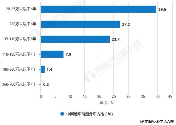 从墙布销量分布来看,据统计,2018年中国20-35万米以下/年销量占比最大,占比39.6%,220万米以下/年销量占比27.2%,35-110万米以下/年销量占比23.7%,110-180万米以下/4年销量占比7.9%,180-360万米以下/年销量占比1.4%,360-700万米以下/年销量占比0.2%。