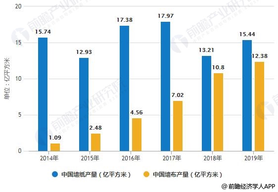 中国墙纸墙布行业起步较晚,但发展迅速,墙布行业的产量更是在近五年实现了高速增长。据统计,截至到2018年中国墙纸产量为13.21亿平方米,同比降低26.5%,墙布产量为10.8亿平方米,同比增长53.8%。预计2019年中国墙纸产量将达15.44亿平方米;墙布产量将达12.38亿平方米。