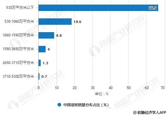 从墙纸销量分布来看,据统计,2018年530万平方米以下销量占比66.6%,530-1060万平方米销量占比18.6%,1060-1590万平方米销量占比8.8%,1590-2650万平方米销量占比4%,2650-3710万平方米销量占比1.3%,3710-5300万平方米销量占比0.7%。