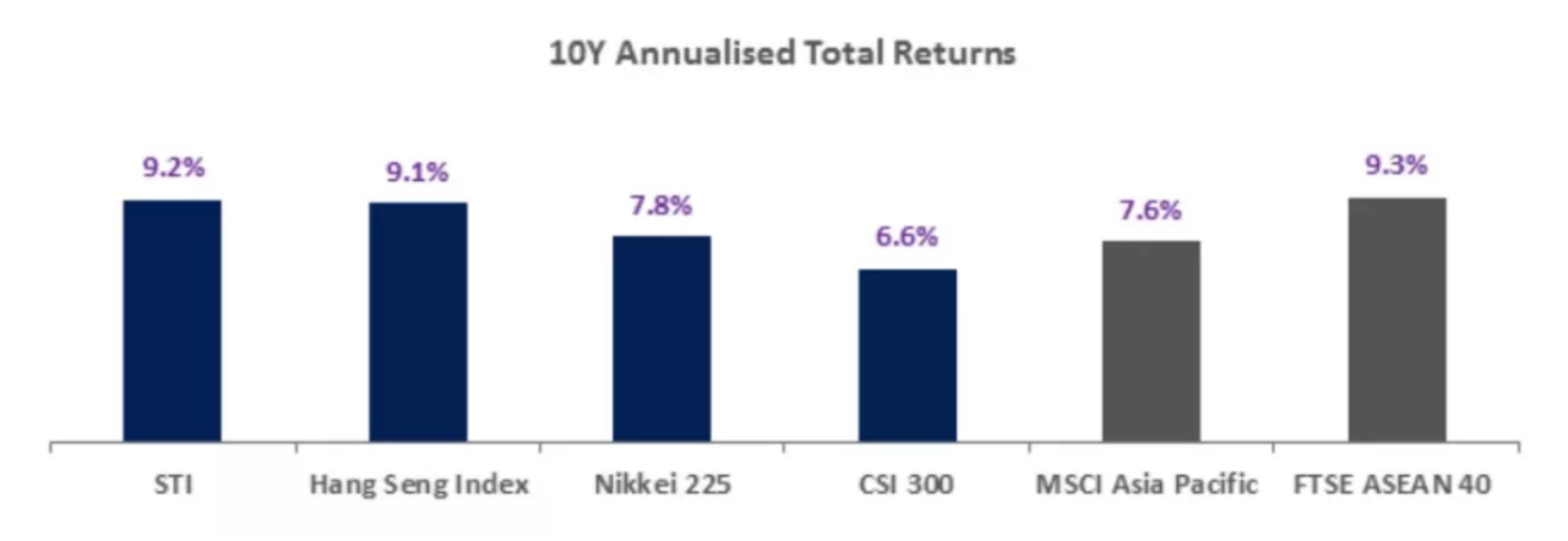 在2008年至2018年的十年间,新加坡市场基准指数海峡时报指数(Straits Times Index, STI)的年化回报率为9.2%,累计回报率超过140%。其表现略优于同期恒生指数的9.1%年化回报,并大幅超出沪深300指数的6.6%年化回报率。