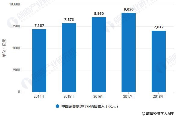 2014-2017年,我国家具行业销售收入逐年增长,受外部环境不稳定等因素的影响,2018年,我国家具制造行业销售收入较2017年大幅减少,为7012亿元。