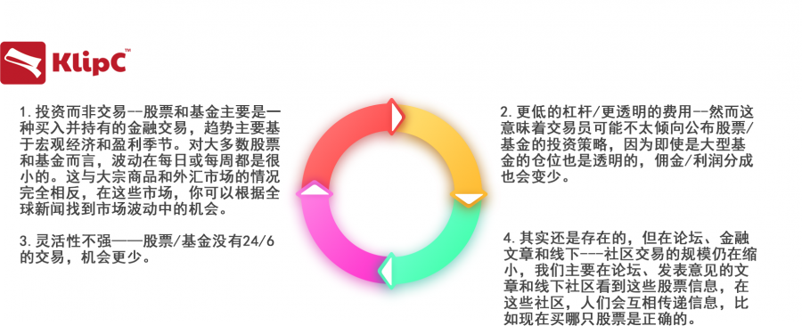 1. 投资而非交易--股票和基金主要是一种买入并持有的金融交易,趋势主要基于宏观经济和盈利季节。对大多数股票和基金而言,波动在每日或每周都是很小的。这与大宗商品和外汇市场的情况完全相反,在这些市场,你可以根据全球新闻找到市场波动中的机会。