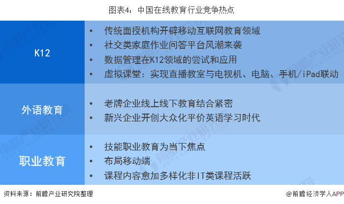 从细分市场竞争情况来看,在线教育创业教育领域众多,包括儿童、早教、语言学习、K12、企业E-learning、职业在线教育等。其中K12在线教育、在线外语培训、在线职业教育等细分领域成为中国在线教育市场规模增长的主要动力,也是近年来市场争夺的重点。