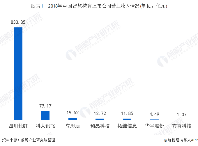 2018年中国智慧教育行业A股上市公司中,七家企业较为典型。7家公司营业收入总额为962.67亿元,其中,四川长虹833.85亿元、科大讯飞79.17亿元、立思辰19.52亿元,排在中国智慧教育上市公司营业收入前三位。