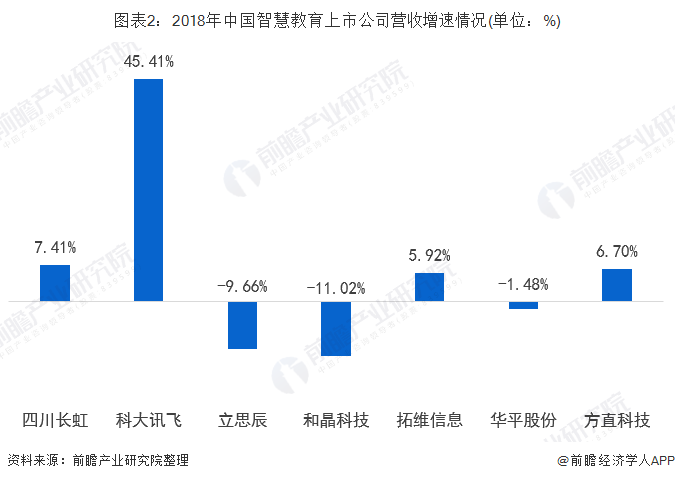 从营收增长幅度来看,增长幅度较大的前三位是科大讯飞、四川长虹和方直科技,分别增长45.41%、7.41%和6.70%。主要是科大讯飞业务拓展、销售规模扩大,教育、智慧城市、消费者等业务增长所致。营业收入增长幅度较缓的两家企业分别是和晶科技和立思辰。