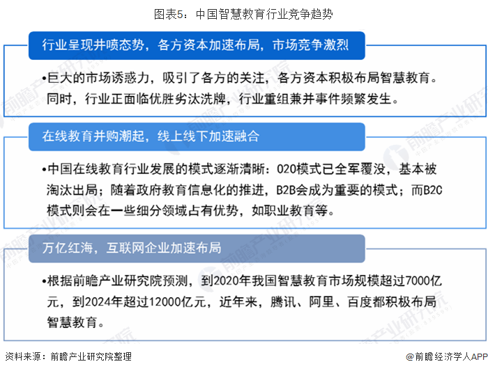 前瞻分析认为,未来在线教育平台作为智慧教育的载体将聚合更多元化的优质教育内容,更好地满足C端用户的学习需求,利用大数据技术实现内容的筛选和精确匹配,为用户生成个性化推荐,提供更好的用户体验。行业的市场竞争会趋于并购融合的姿态,孕育出细分领域的龙头智慧教育企业,线上线下加速融合,互联网企业加速布局。