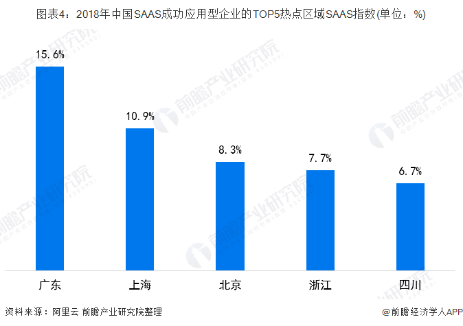 分地区来看,SAAS市场主要分布在华东、华北和华南地区。据阿里云数据显示,2018年,中国SAAS区域市场排行榜的前五位分别为广东、上海、北京、浙江和四川。