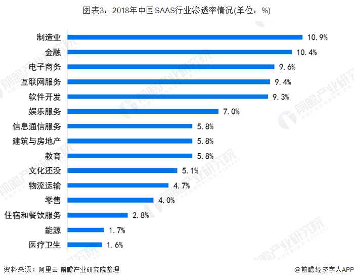 目前,SAAS在各个下游的渗透率还不是很高。分行业来看,制造业、金融、电子商务、互联网服务、软件开发等渗透率相对较高,在10%左右,其中制造业渗透率达10.9%,渗透率相对较高的行业多数与大数据有关,反映出我国SAAS行业“风口”已发生迁移,逐步偏向数字化发展。