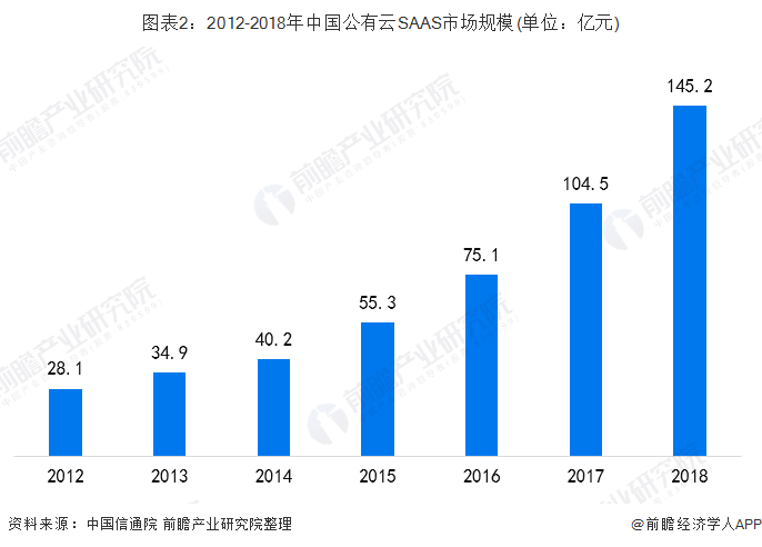 我国SAAS市场已进入高速发展阶段,根据中国信通院统计数据显示,2012年,中国公有云SAAS市场规模仅有28.1亿元,至2018年,中国公有云SAAS市场规模达145.2亿元,较2017年增长38.95%。