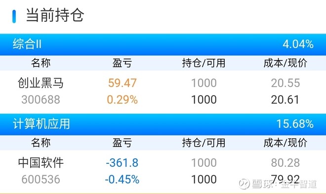 我今天的持仓有创业黑马,中国软件。