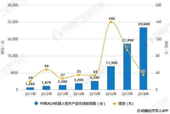 2011-2018年中国AGV机器人相关产品市场新增量统计及增长情况
