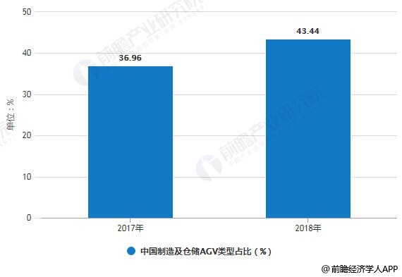 根据高工产研机器人研究所(GGII)数据,2018年制造及仓储AGV领域需求仍持续强劲,制造及仓储AGV类型占比达到43.44%,较2017年同期上升6.48个百分点。