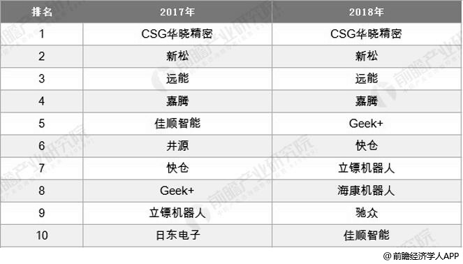 2017-2018年中国移动机器人保有量份额TOP10统计情况