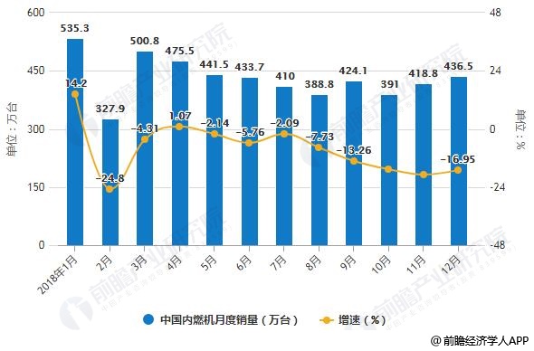 2018年1-12月中国内燃机月度销量统计及增长情况