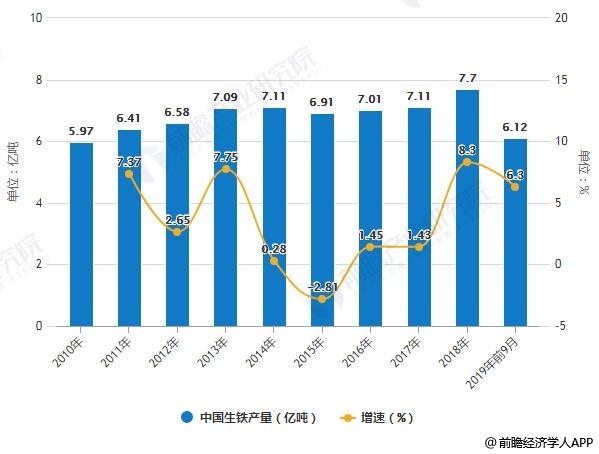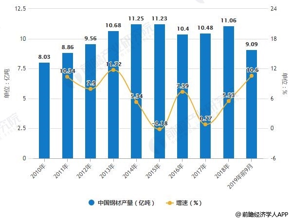 2010-2019年前9月中国钢材、粗钢、生铁产量统计及增长情况