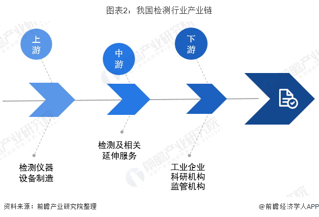 检测行业产业链的上游是检测仪器设备的制造,中游为检测及相关延伸服务,下游则涉及国民经济各个行业。检测行业产业链如下图所示: