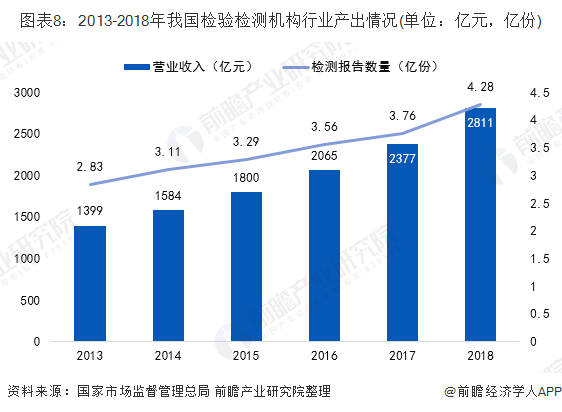 2013-2018年,我国检测行业营业收入逐年增多,出具检测报告的数量不断增长,反映出我国检测行业市场需求较为旺盛。2018年,我国检验检测行业实现营业收入2810.5亿元,出具检测报告4.28亿份。