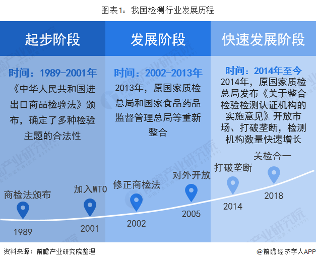 检测行业是指检测机构接受用户的委托,综合运用科学方法及专业技术对某种产品的质量、安全、性能、环保等方面进行检测,出具检测报告,从而评定该种产品是否达到政府、行业和用户要求的质量、安全、性能及法规等方面的标准。1989年,《中华人民共和国进出口商品检验法》颁布,我国开始放开外资和民营检验检测业务。2018年,我国商检法再次修正,将“商检机构”修改为“认证机构”,“国家商检部门”修改为“国务院认证认可监督管理部门”。下图为我国检测行业的发展历程: