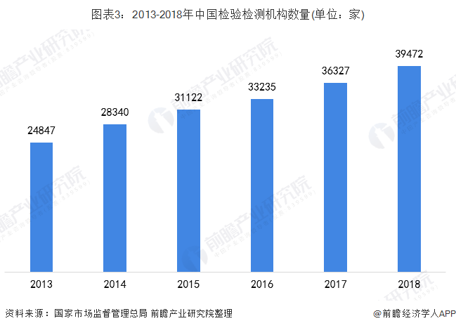 2013-2018年,我国检验检测机构数量逐年递增。据国家市场监督管理总局统计数据显示,截至2018年底,我国共有39472家检验检测机构。