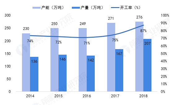 2014-2018年,我国有机硅单体产能逐渐提高,产量逐年增多,2018年,我国有机硅单体产能为275万吨/年,开工率达87%。