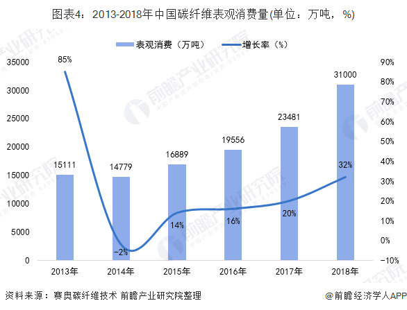 随着科技的发展,碳纤维的应用领域与日俱增,除了广泛应用于航空航天等高技术领域,还可用在文体用品、纺织机械、医疗器械、生物工程、建筑材料、化工机械、运输车辆等方面。中国碳纤维需求量一直维持稳步上升趋势,2018年国内碳纤维市场需求为3.1万吨。