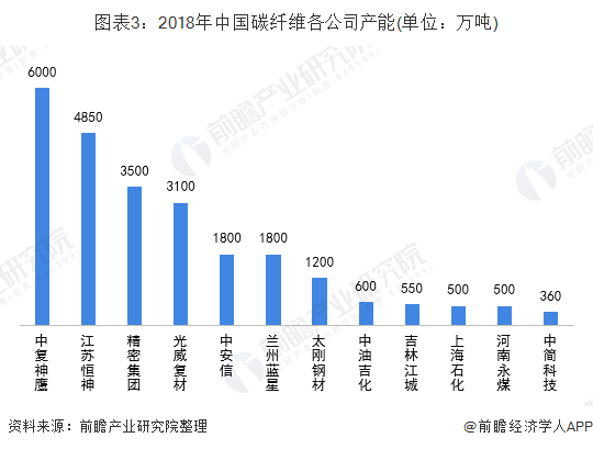 目前国内T300级碳纤维性能达到国际水平,主要运用于航空航天及体育休闲等领域;T700级碳纤维已建成千万吨级生产线,低成本干喷湿纺T700级碳纤维已经实现规模化生产;中国首条千吨级T800原丝生产线由中复神鹰生产线2016年投产;但T800级以上的碳纤维国内企业还处于小规模试验,技术相对东丽还是存在较大差距。中国在T800级别以上的碳纤维生产中都还是处于小批量试验生产阶段,而国外的东丽公司已经实现了比较成熟的高模产品。2018年中国碳纤维公司产能前三名是:中复神鹰、江苏恒神以及精密集团。