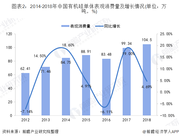 目前,我国已成为世界有机硅材料最大的消费国,近年来,我国有机硅单体表现消费量整体呈现震荡上升趋势,据统计,2018年,我国有机硅单体表观消费量约为104.5万吨,较2017年增长4.69%。