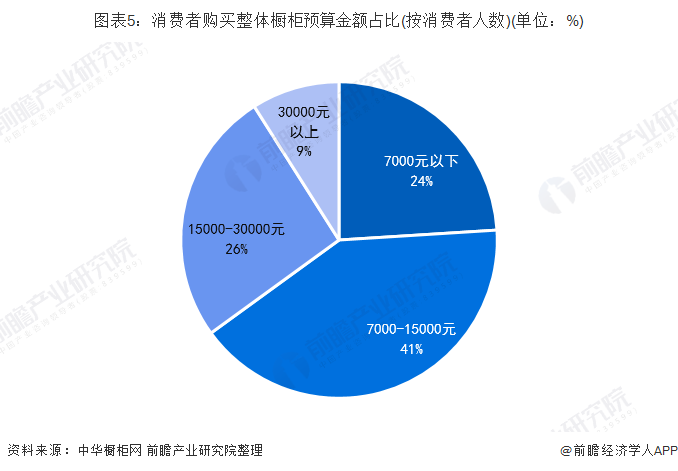 从消费者购买整体柜橱的预算金额来看,预算在7000元-15000元区间的消费者最多,所占比重达41%,15000-30000元之间的位列第二,占比26%,仅有9%的消费者会选择30000元以上的产品,整体来看,我国消费者购买橱柜仍然以中低端产品为主。