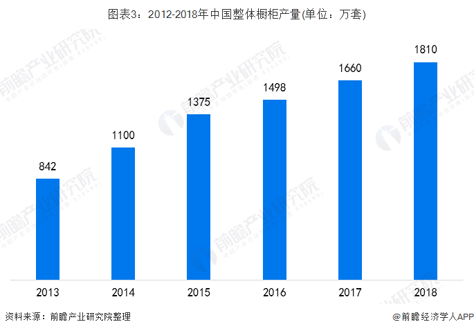 近年来,随着城镇人口的增长、人均收入的提高,我国整体橱柜的需求量逐渐提升,我国橱柜行业整体产量呈现稳步提升的增长态势。2018年,我国整体橱柜产量达1810万套,较2017年增长9.04%。