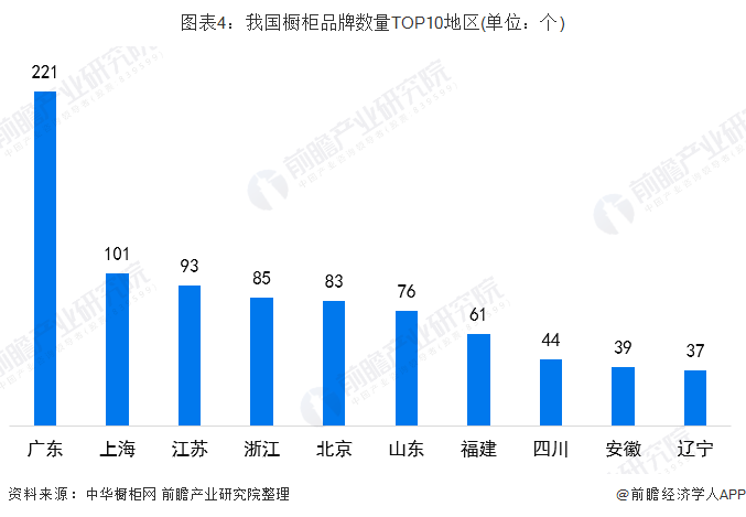 从区域分布上看,我国华南与华东地区的橱柜品牌更为密集。广东省区位优势明显,现已成为定制家居行业的主要聚集区,橱柜品牌数量全国第一。统计数据显示,截至2018年底,我国广东省品牌数量超200个。