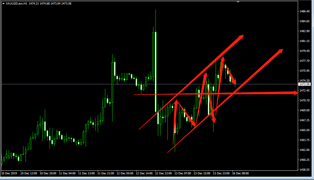 黄金行情回顾:即上一波非农利空黄金之后,黄金并没有跟随趋势持续下跌,我们从小时图来看,形成了一阶段非常明显的三顶结构,每次小幅上涨的背后都伴随着下跌,随着黄金小幅盘整上调,现黄金已在1470-1475之间动荡。
