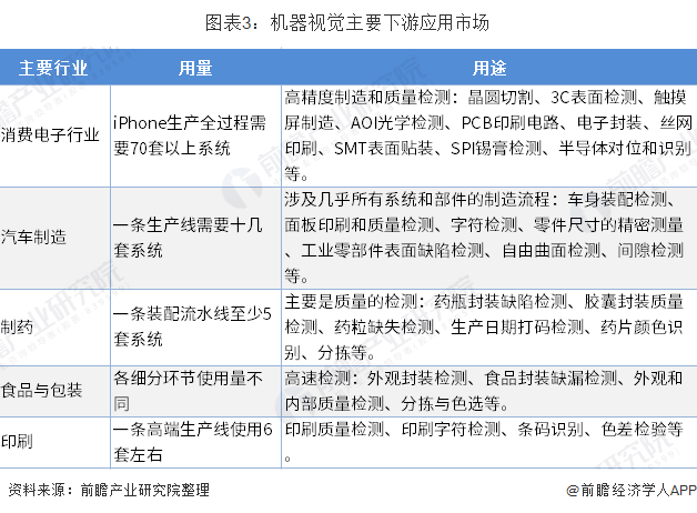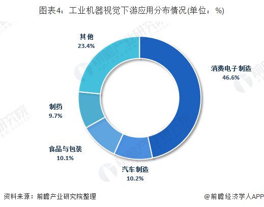 工业是目前机器视觉应用比重最大的领域,在工业机器人视觉下游应用中,又以消费电子制造和汽车制造为主,两者分别应用占比为46.6%和10.2%。