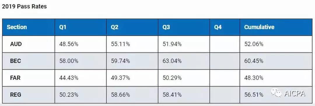 在此成绩公布之前,同学们也不必太过紧张,一般AICPA考试都能一次性通过,因为全球通过率也高,以2019年前三季度通过率举例: