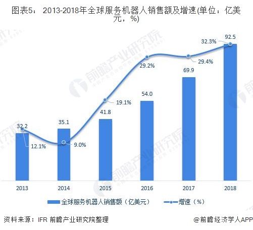 从2013-2018年全球服务机器人的销售规模来看,2013-2018年全球服务机器人的市场规模处于逐年增长的态势,尤其是自2016年起,年增长率在30%左右且还在逐年上升。2018年年增长率为32.3%,可以说全球服务机器人行业一片繁荣,我国作为全球最大的服务机器人市场之一,在国内技术、投资、政策以及需求的刺激下,服务机器人行业必将得到长足的发展。