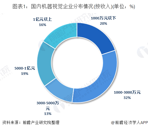 我国机器视觉公司规模普遍较小,根据中国机器视觉产业联盟数据,国内营收在1000万元以下小型企业占据了20%左右,营收在1000-3000万元的企业数量占据了32%左右。营收在1亿元以上企业仅占16%。