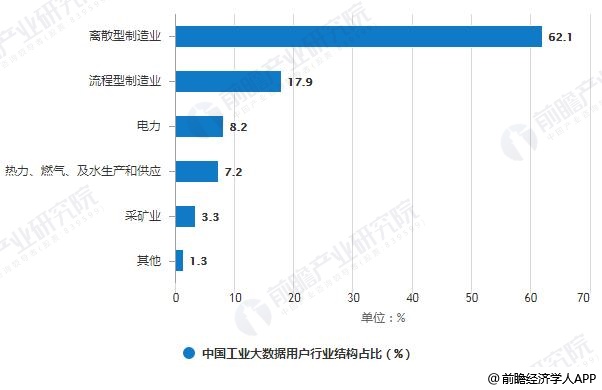 在工业大数据用户行业结构中,离散型制造业企业由于设备和零部件数量多,零部件变更困难,设备故障检测过程繁琐等因素对大数据需求较高,占比达到62.1%。