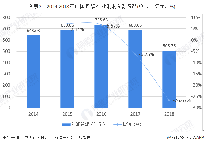 从利润总额情况来看,2014-2016年,中国包装行业利润总额呈稳步上升的趋势,2016年,行业利润总额达735.63亿元,达近年来最高峰。2017-2018年,行业利润总额呈下降的趋势,2018年行业利润总额达505.75亿元,较2017年同比下降26.27%。