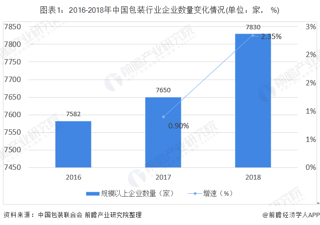 2016-2018年,我国包装行业规模以上企业数量(年主营业务收入2000万元及以上全部工业法人企业)呈稳步上升的趋势。这反映行业入局者逐渐增多,市场竞争日益及利润。根据中国包装联合会统计数据显示,2018年中国包装行业规模以上企业数量达7830家。