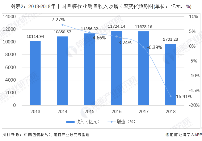 我国包装行业经历了高速发展阶段,已经建立起相当的生产规模,已经成为我国制造领域里重要的组成部分。2018年,受宏观经济遇冷影响,我国包装行业遭遇寒冬,销售收入、利润总额、产量均显颓势。