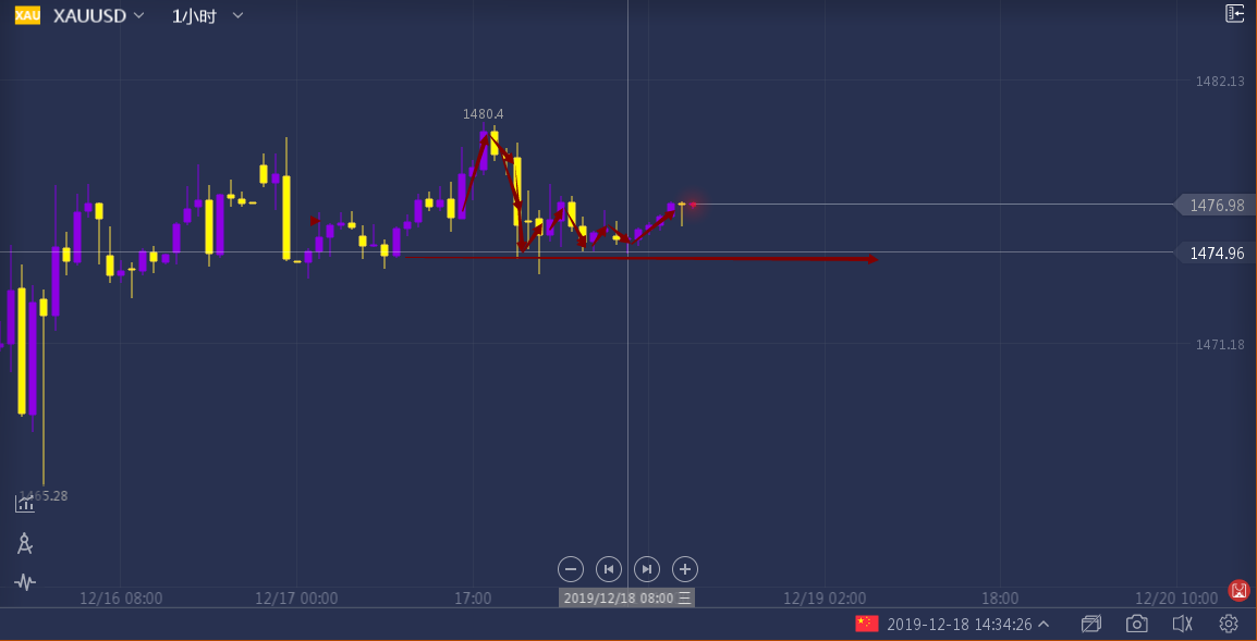 昨日亚盘开盘黄金波幅不大,一直维持在在1475-1477区间震荡,欧盘开盘开始出现上升趋势,晚间美盘开盘后,黄金冲击到了昨日最高点1480.6后承压回落,1480-1484为上方阻力区间也起到关键性的作用,昨天我们1484处看空的策略毫无疑问也是令我们有所收获。
