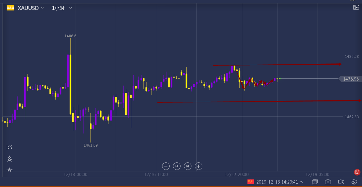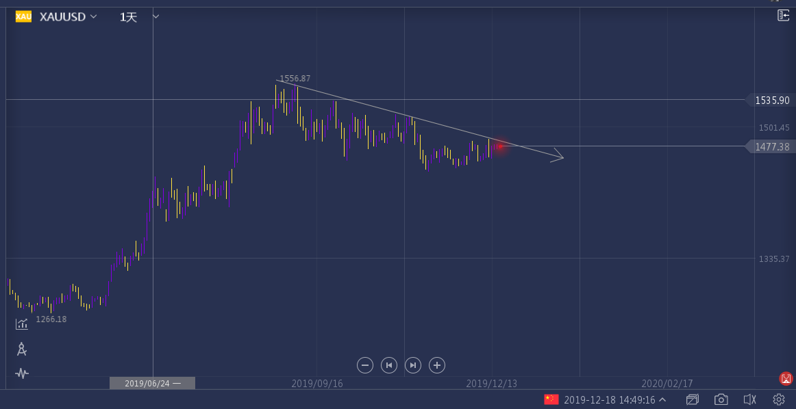 我们观察近半年的趋势线,从九月份达到近半年的最高点以来,黄金下行趋势明显,临近圣诞节,黄金行情多冷清,还会继续震荡,不会有太大的涨幅,突破1490的可能性基本不存在,目前所处的位置,我认为没有任何理由会去能说服我看向多头