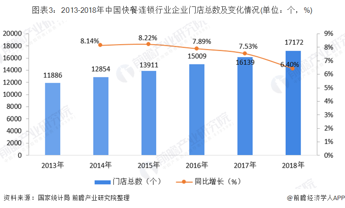 快餐连锁行业总店数量持续扩张,门店总数增速放缓