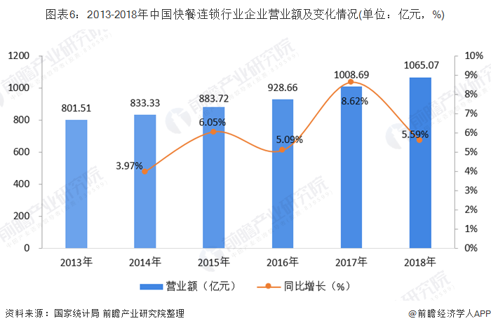 2013-2018年,中国快餐连锁企业营业额呈增长趋势,从2013年的801.51亿元增长至2018年的1065.07亿元。