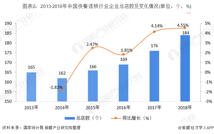 2013-2018年,中国快餐连锁企业的总店数整体呈增长趋势,总店数从2013年的165个增长到2018年的184个。