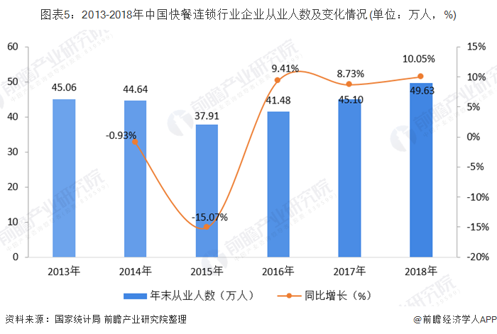 2013-2018年,中国快餐连锁企业从业人数呈现先下降后增长趋势,在经历了2013-2015年的连续三年下降后,2016年从业人数出现明显增长,同比增长9.41%,达到41.48万人。2018年,从业人数继续增长,同比增长10.05%,达到49.63万人。